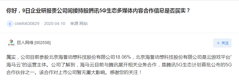 4月30日,巨人網絡在互動易上回復投資者關于是否間接持股騰訊5G生態合作伙伴海馬云,稱屬實。目前巨人持有北京海譽動想科技股份有限公司(簡稱“北京海譽動想”)18.06%的股份,海馬云是后者旗下產品。