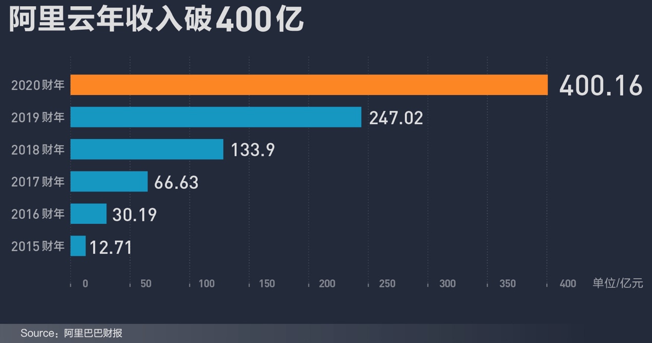 2020財年第四季度內,阿里云營收達122億元,環比大幅增長,單季度收入連續第二個季度突破百億元大關。對比歷史數據,2015財年阿里巴巴首次披露云計算營收,當年阿里云收入為12.71億元,到2020財年營收400億元,6年間增長了31倍。