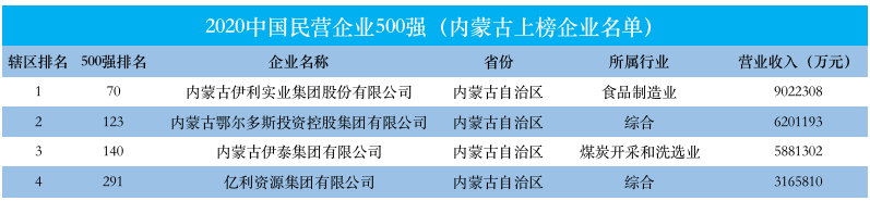 今年的“中國民營企業500強”榜單中,內蒙古入圍的4家企業均位居前300名。內蒙古伊利實業集團股份有限公司以902.23億元的營業收入名列榜單第70位,蟬聯食品行業第一;內蒙古鄂爾多斯投資控股集團有限公司以620.12億元的營業收入位列榜單123位;內蒙古伊泰集團有限公司以588.13億元的營收位列榜單第140位;億利資源集團有限公司以316.58億元名列榜單291位。