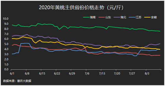 由惠農(nóng)網(wǎng)大數(shù)據(jù)生成的全國主要黃桃產(chǎn)地價格走勢圖(供圖:惠農(nóng)網(wǎng))