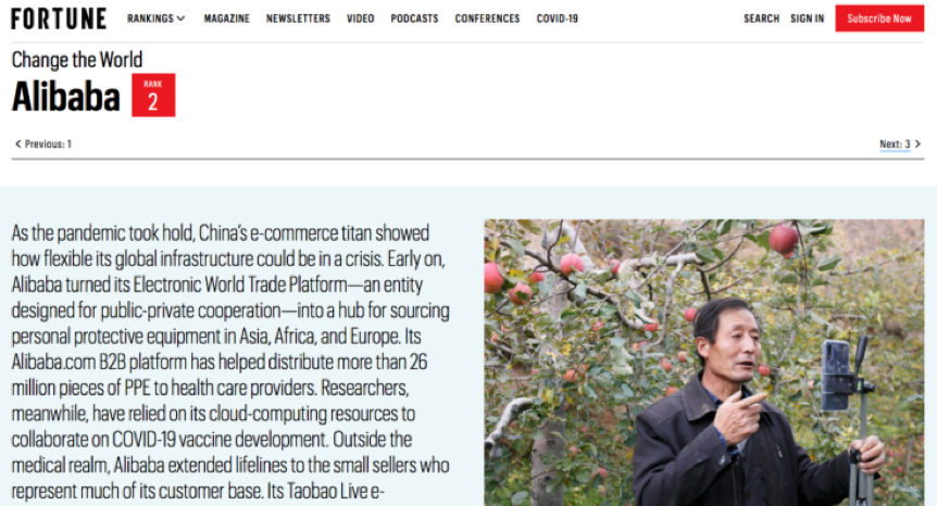 在美國《財富》雜志近日發布的“2020改變世界的企業”榜單中,阿里巴巴集團(下稱“阿里”)第六次上榜,并首度位列榜單第二。榜單稱,阿里在疫情期間展示了其全球基礎設施在危機中的靈活性,特別是淘寶直播平臺在農村供應鏈受疫情阻斷后,幫助農戶開拓了新用戶。