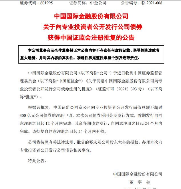 2月19日晚間,中金公司發布公告稱,于近日收到中國證監會《關于同意中國國際金融股份有限公司向專業投資者公開發行公司債券注冊的批復》(以下簡稱“批復”)。