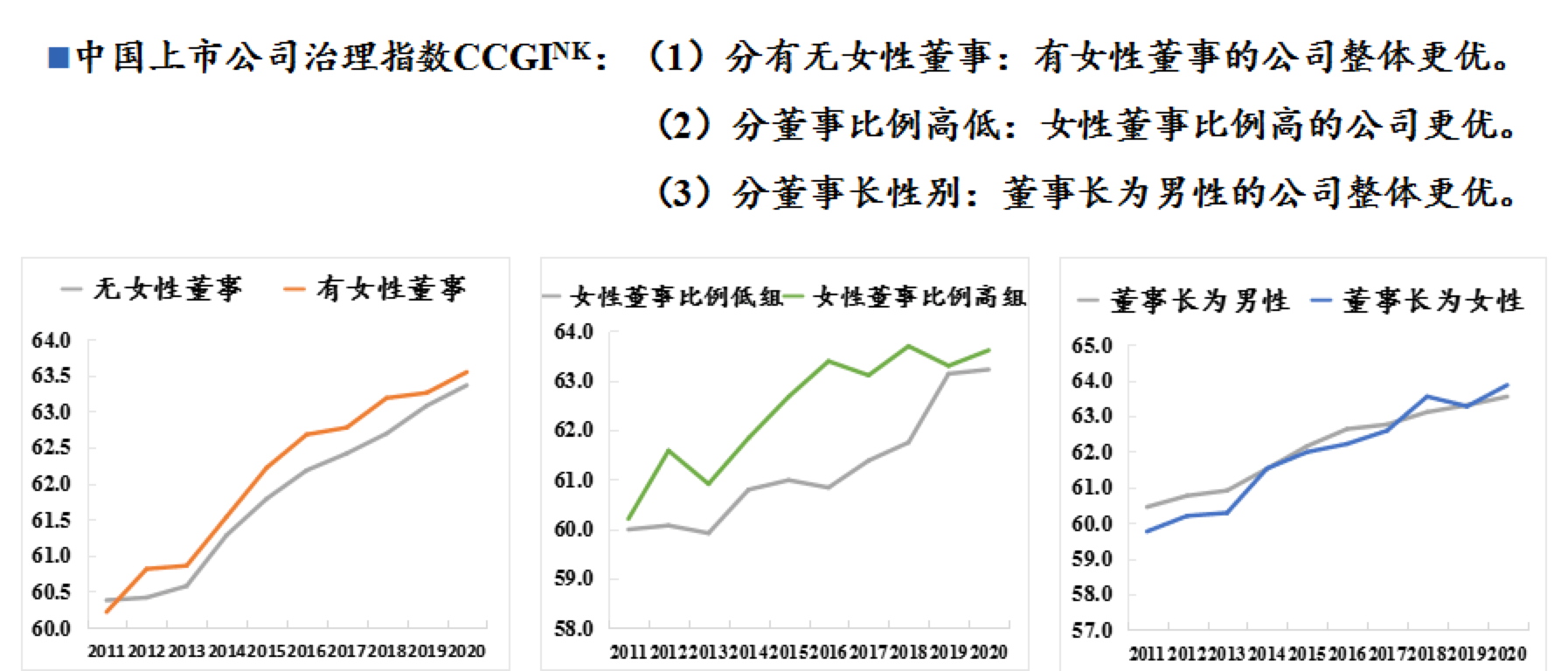 實際上,據前述《報告》,雖然在過去十年間女性董監高的數量正不斷增加,目前,女性董事參與上市公司戰略決策的程度仍然較低。數據顯示,即便有72.77%的上市公司設置了女性董事,但其中50%以上的女性董事僅是獨立董事。《報告》中提到,有觀點認為,多元化可以提高董事會的決策水平,改善公司與投資者、外部團體及顧客的關系,甚至直接提高公司的績效等。而從中國上市公司治理指數來看,有女性董事及女性董事比例高的公司整體表現的確更勝一籌。