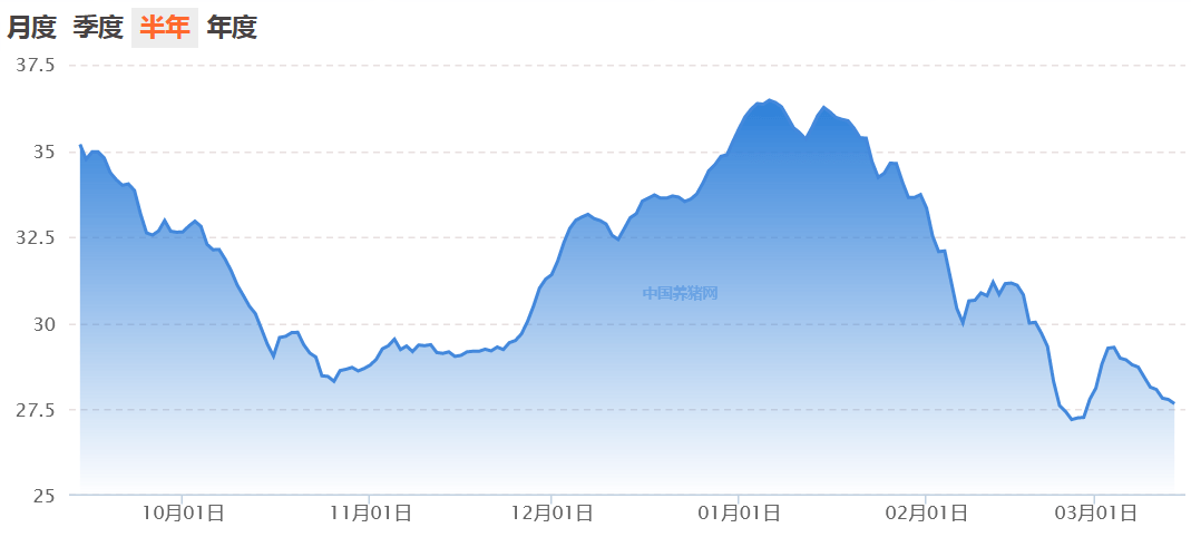 根據(jù)農(nóng)業(yè)農(nóng)村部對全國500個集貿(mào)市場監(jiān)測,3月份第一周,全國豬肉價格每公斤47.46元,連續(xù)6周下降,同比下降19.8%。機(jī)構(gòu)預(yù)計,2021年一季度全國生豬出欄同比大概會增長40%左右,豬肉價格水平還會下降。