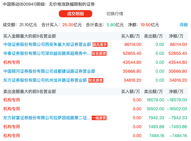 同時,同花順顯示,今日中國移動A股也登上龍虎榜,凈買入額為19.5億元,買入前五名包括多家知名券商營業部。