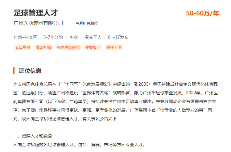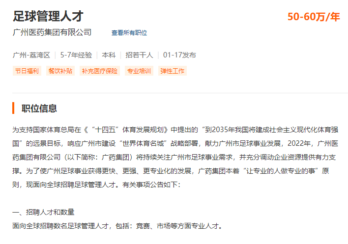 根據廣藥集團招聘廣告,2022年廣藥集團將持續關注廣州市足球事業需求,并充分調動企業資源提供有力支撐。為了使廣州足球事業獲得更快、更強、更專業化的發展,公司面向全球招聘足球管理人才,包括競賽、市場等方面專業人才,要求5-7年工作經驗,薪酬為50-60萬元/年,工作內容包括進行商務開發、負責俱樂部準入、球員注冊轉會等。