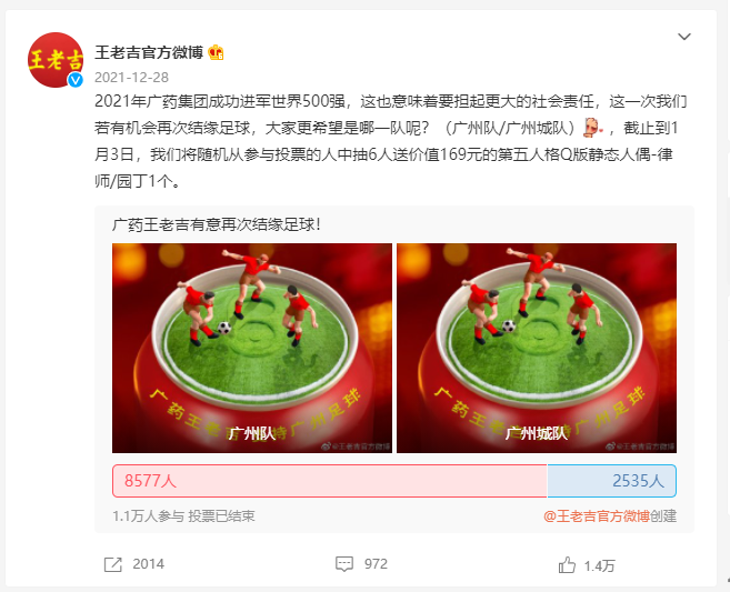 廣藥集團董事長李楚源曾在2021年12月27日廣州市第十二次黨代會上公開表示,2022年廣藥集團有意與廣州足球事業再次結緣。廣藥集團旗下品牌王老吉去年12月28日也在微博發起投票,征求網友對“廣州隊”或“廣州城隊”二選一的意見,截至2021年1月3日吸引了約1.1萬人投票。