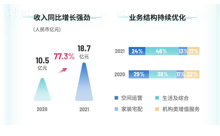 雅生活一直聚焦社區生活服務,大力發展市場化業務,并通過資本驅動、自營孵化、合作試點、跨界合作等方式,不斷突破業務邊界,打造雅生活收入增長第二曲線。年內,集團業主增值服務收入達18.67億元,同比大幅增長77.3%,占總收入約13.2%,相比2020年占比提升了2.7%。