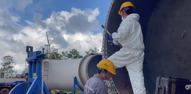 時代新材現場工程師正在吊裝葉片(供圖:時代新材)