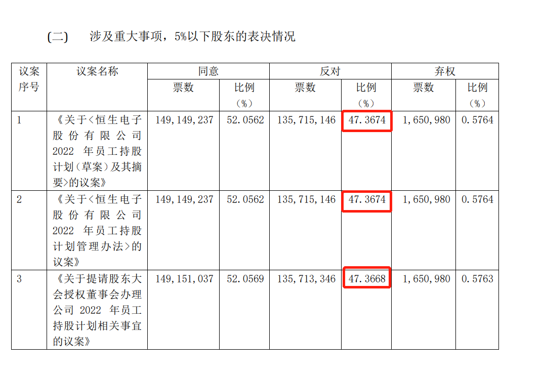 7月20日,恒生電子股份有限公司(簡(jiǎn)稱:恒生電子)發(fā)布了2022年第二次臨時(shí)股東大會(huì)決議公告,公司以76.69%的同意率,通過(guò)了關(guān)于公司2022年員工持股計(jì)劃的議案,其中,反對(duì)票占比高達(dá)23.03%,其余約0.28%為棄權(quán)票。