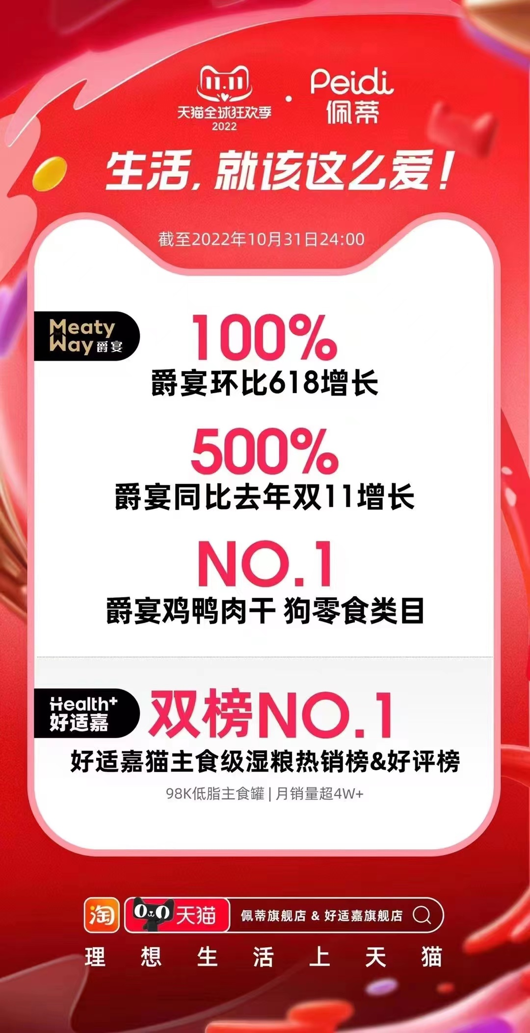 在“年度狗類爆款大獎”榜單中,佩蒂出品的爵宴鴨胸肉干榜上有名。截至10月31日,在今年的“雙11”活動中,爵宴鴨胸肉干成績斐然,已摘得天貓狗零食類目NO.1。爵宴品牌整體環比618增長100%,同比去年“雙11”增長500%。