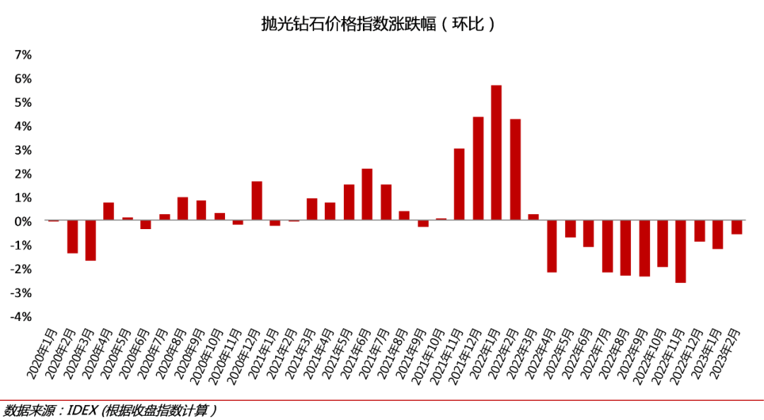 近期國際鉆石價(jià)格一路下滑的趨勢或許是答案。據(jù)我愛鉆石網(wǎng)發(fā)布統(tǒng)計(jì)數(shù)據(jù),國際IDEX成品鉆價(jià)格指數(shù)自2022年3月開始從高點(diǎn)一路下跌,2022年11月開始出現(xiàn)同比負(fù)增長,2023年春節(jié)月更是同比降幅近15%。截至2023年2月,該指數(shù)累計(jì)環(huán)比下跌11個(gè)月,且下跌幅度逐步加深。