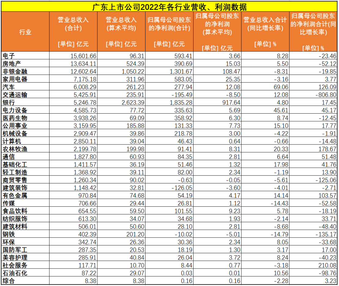 自制圖表:廣東上市公司2022年各行業(yè)營收、利潤數(shù)據(jù)