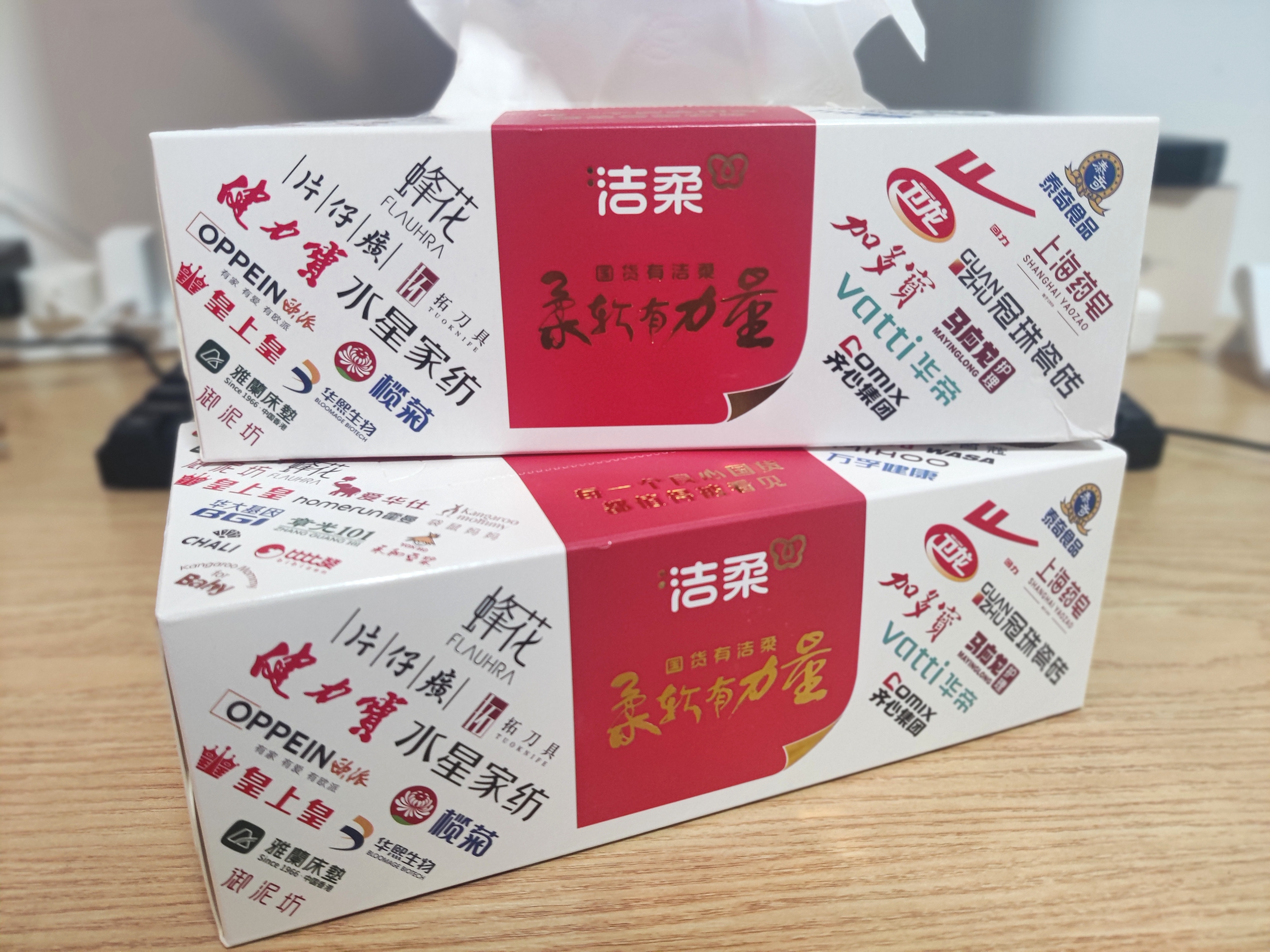 潔柔印有眾多國(guó)貨品牌logo的45周年定制版紙巾 劉曉一/攝