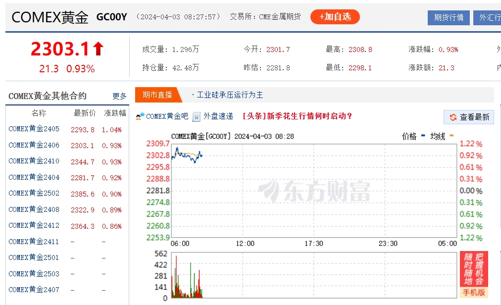 東方財富Choice終端顯示,北京時間4月3日早間8點左右,紐約商業期貨交易所掛牌交易的COMEX黃金期貨合約(代碼:GC00Y)升破2300美元/盎司。國際金價再度走強,引發國內多家上市公司對金礦資源的高度重視?!蹲C券日報》記者了解到,當前全球單體金礦資源趨于下降,礦石品位走低,國內企業依靠先進采掘及冶煉回收技術,從伴生礦及城市礦山中提取黃金,成為眼下布局金礦資源、擴大有效產能的重要舉措。