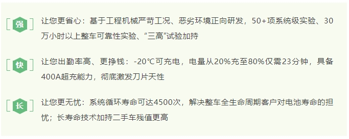 活動現(xiàn)場,濰柴重磅發(fā)布全系列工程機(jī)械新能源動力電池產(chǎn)品,覆蓋裝載機(jī)、挖掘機(jī)、礦卡等市場,具有超級安全、超長壽命、超高強(qiáng)度、超級快充等性能優(yōu)勢,為客戶提供多元、低碳、高效的新能源動力解決方案,引領(lǐng)行業(yè)新變革。