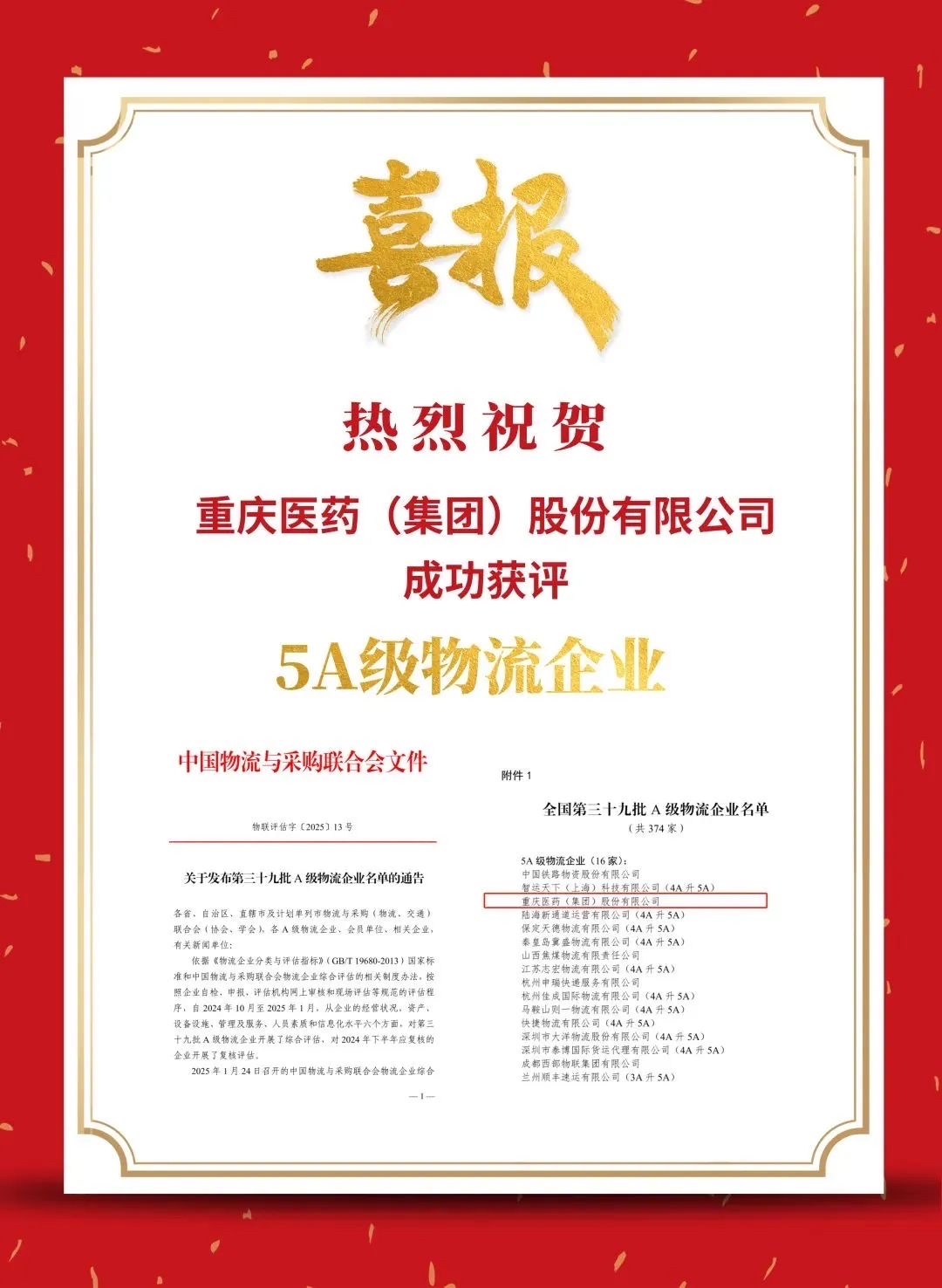 本報訊 (記者馮雨瑤)2月8日,據“重藥控股”官方微信公眾號消息,1月31日,中國物流與采購聯合會發布第39批A級物流企業名單,重藥控股股份有限公司(以下簡稱“重藥控股”)所屬重慶醫藥(集團)股份有限公司成功獲評5A級物流企業。這一殊榮不僅是對重藥控股多年來深耕醫藥供應鏈領域、持續提升物流服務能力和水平的充分肯定,更是公司在西部陸海新通道建設中發揮重要作用的有力證明。