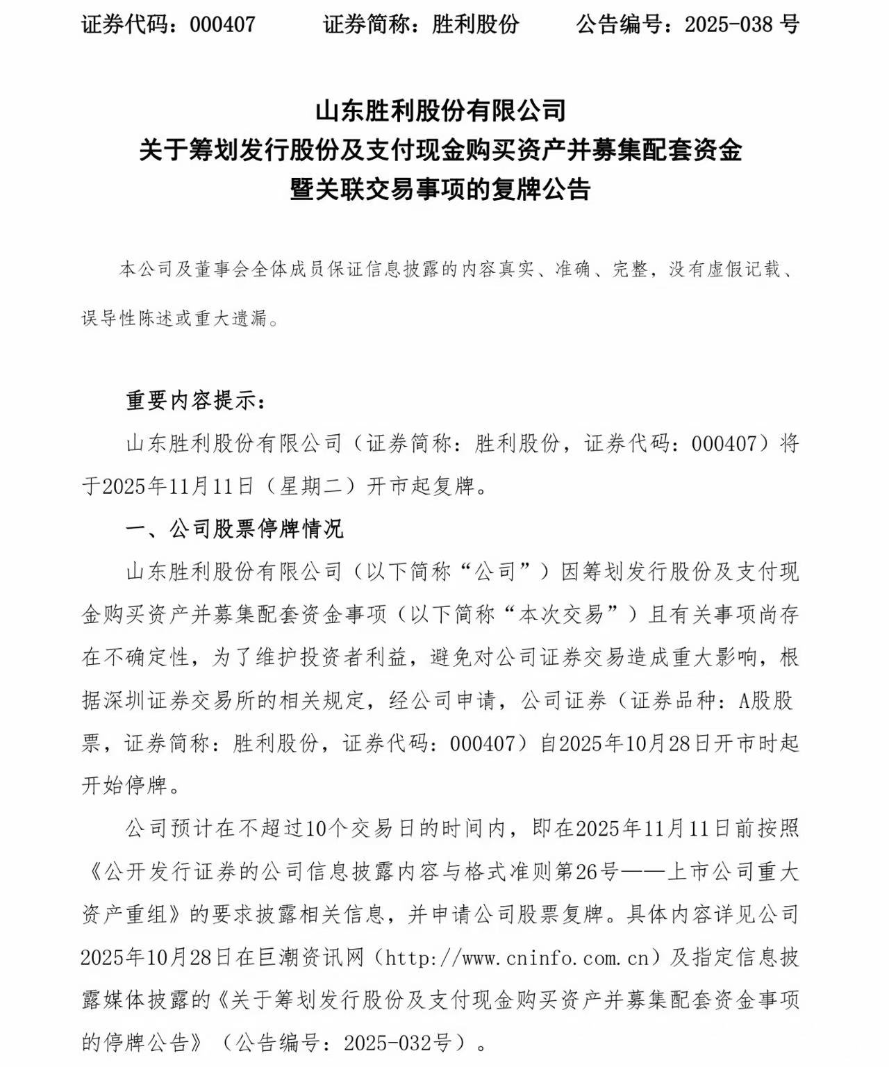 根據公告,勝利股份股票將于11月11日(星期二)開市起復牌。此前,勝利股份股票于10月28日起停牌。