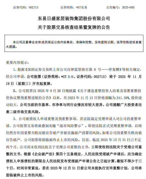 公告顯示,公司股票自2025年9月26日晚披露《關于遴選重整投資人結果及簽署重整投資協(xié)議暨預重整進展的公告》以來,至2025年11月13日價格漲幅為241.59%。為維護投資者利益,公司股票自2025年11月14日開市起停牌核查,于2025年11月19日(星期三)開市起復牌。