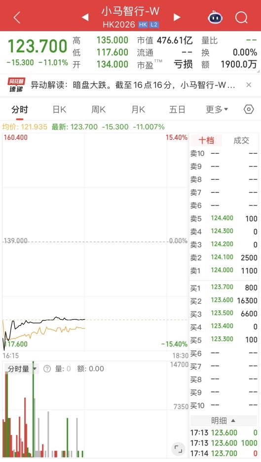 本報訊 (記者袁傳璽)11月5日,小馬智行-W(以下簡稱“小馬智行”)港股暗盤開盤跌超15%,截至17:15,跌幅收窄至11.01%,報價123.7港元/股。據了解,小馬智行確定全球發售最終發售價為每股139.00港元,全球發售所得款項總額(未扣除包銷費用及開支)預計約67.1億港元。