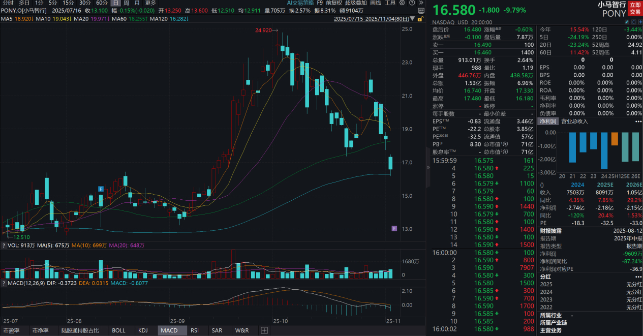 實際上,自10月2日小馬智行股價創下歷史新高24.92美元/股后,截至美國當地時間11月4日,其股價回調幅度已超過33%。