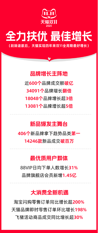 今年以來(lái),天貓?zhí)岢鋈Ψ龀謨?yōu)質(zhì)品牌和原創(chuàng)商家,投入戰(zhàn)略級(jí)資源做大品牌增長(zhǎng)。2025年天貓“雙11”,天貓實(shí)現(xiàn)了四年來(lái)“雙11”全周期最好的一次增長(zhǎng)。天貓始終是優(yōu)質(zhì)品牌商家的增長(zhǎng)主陣地,天貓“雙11”始終是優(yōu)質(zhì)品牌商家全年最重要的增長(zhǎng)機(jī)會(huì)。