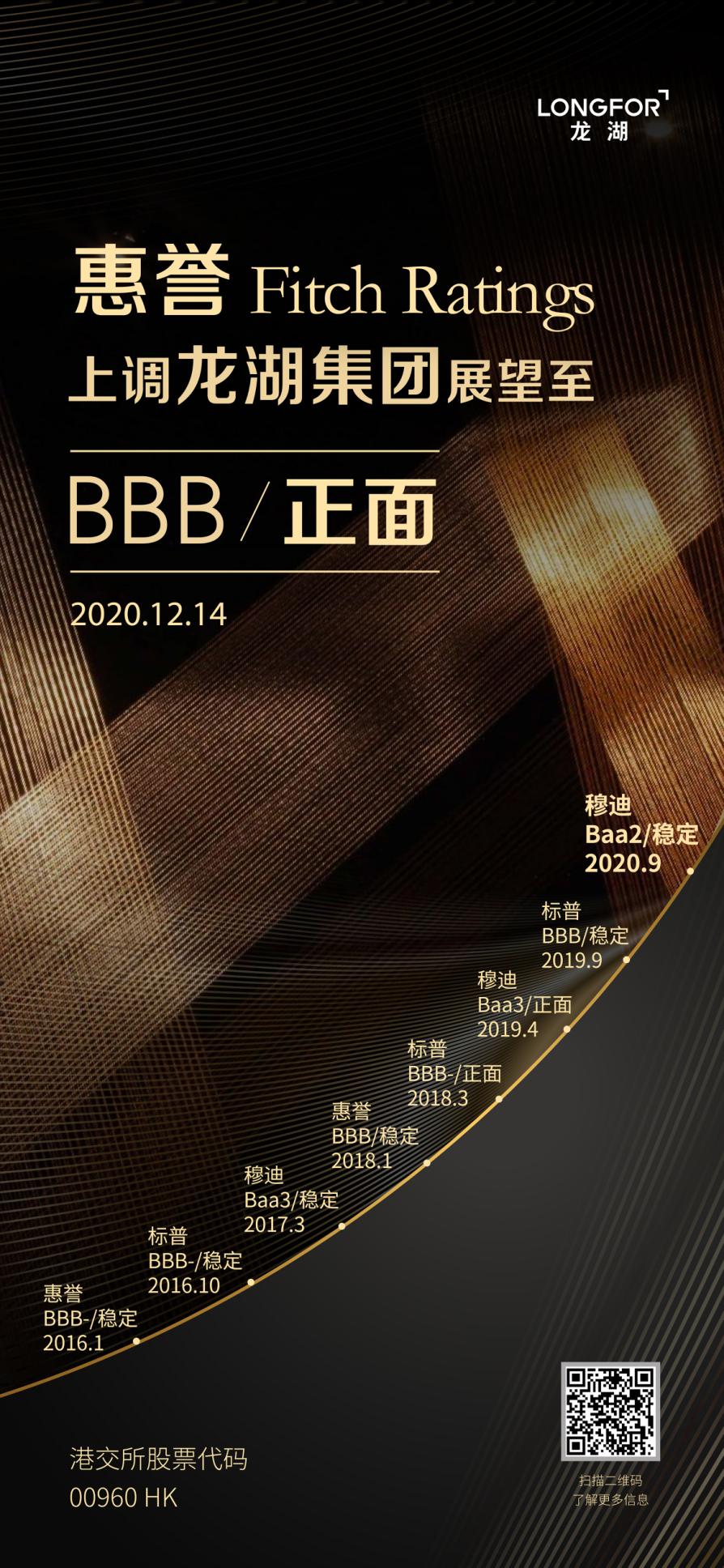 12月14日,龍湖集團控股有限公司(港交所股份代號:960)宣布,國際權威信用評級機構惠譽(Fitch)已將龍湖展望調升至正面,發行人和高級無擔保債券評級維持BBB。龍湖亦成為2020年至今中國全投資級房企中唯一一家獲兩家國際機構調升評級/展望的企業。