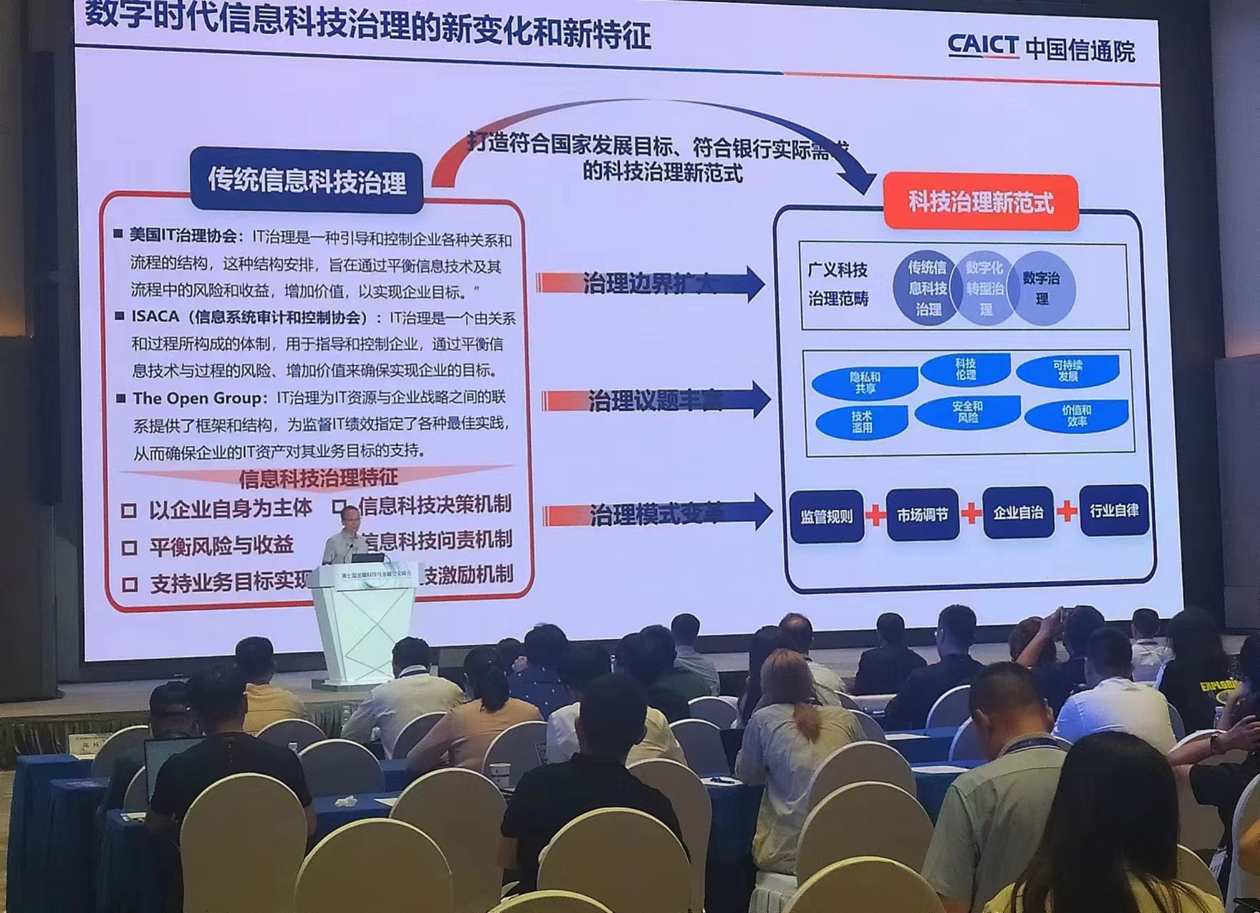 魏凱介紹,現代化科技治理的新變化主要體現在三方面:一是治理邊界的擴大,從傳統的信息科技治理逐漸演變到了對數字化轉型的治理;二是治理議題的豐富,包括數據隱私和共享、科技倫理、可持續發展、技術安全風險、價值效率等等;三是治理模式的變革,數字時代的科技治理需要多元共治,包括監管規則設定、市場行為調節、企業自治以及行業自律。