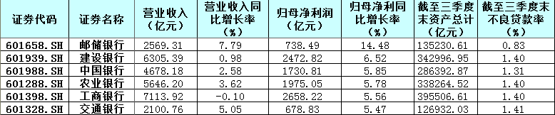 三季報顯示,今年前三季度國有六大行凈利集體飄紅,全年合計實現歸母凈利潤1.03萬億元,同比增長6.47%。今年前三季度,工商銀行、建設銀行實現歸母凈利潤均超過2000億元,分別為2658.22億元和2472.82億元。郵儲銀行實現歸母凈利潤盡管在國有六大行中最少,僅為738.49億元,但該行歸母凈利潤同比增幅高達14.48%,增幅為六大行之首。