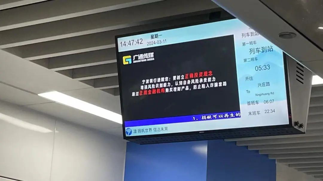 “熟人作保沒風險,保本短期賺翻天?高息詐騙隨處見,錢財不久全被騙!”這是寧波銀行在一個金融知識短視頻中的風險提示,該視頻通過講述一位受害人陷入高息詐騙的投資陷阱,提醒消費者要樹立正確的投資觀念,增強風險識別能力,要通過正規(guī)金融機構購買理財產品。目前該視頻已在寧波市5條地鐵線路和市區(qū)所有公交線路共10730個移動視頻終端進行展播,并將連續(xù)播放3個月。