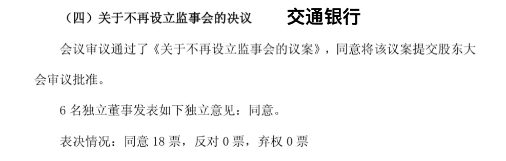 公告顯示,五家銀行董事會均通過了不再設立監事會的相關議案,相關議案尚需提交銀行股東大會審議通過。