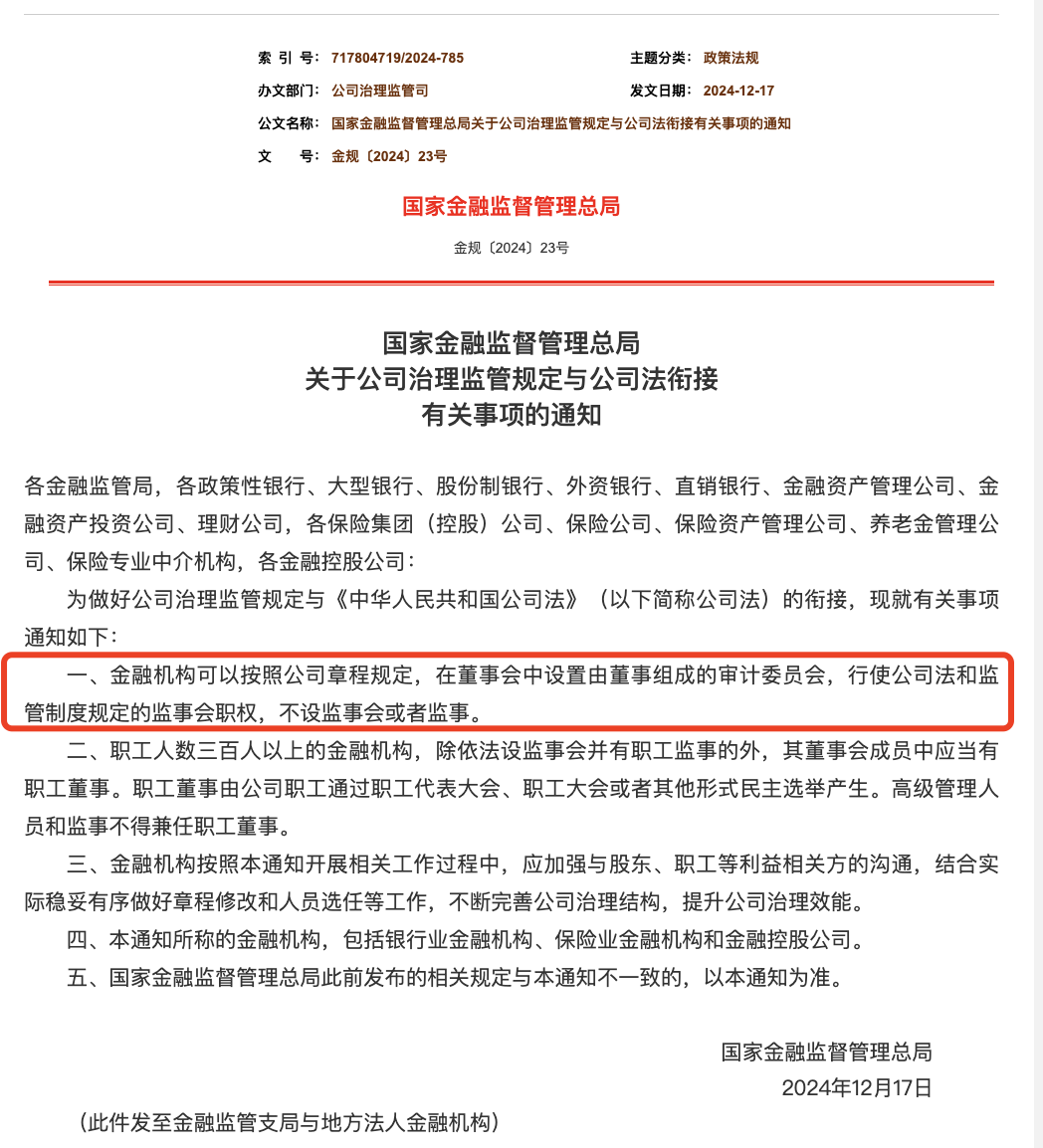 為做好公司治理監管規定與《中華人民共和國公司法》的銜接,2024年12月份,國家金融監督管理總局印發《關于公司治理監管規定與公司法銜接有關事項的通知》(以下簡稱《通知》),其中提到,金融機構可以按照公司章程規定,在董事會中設置由董事組成的審計委員會,行使公司法和監管制度規定的監事會職權,不設監事會或者監事。
