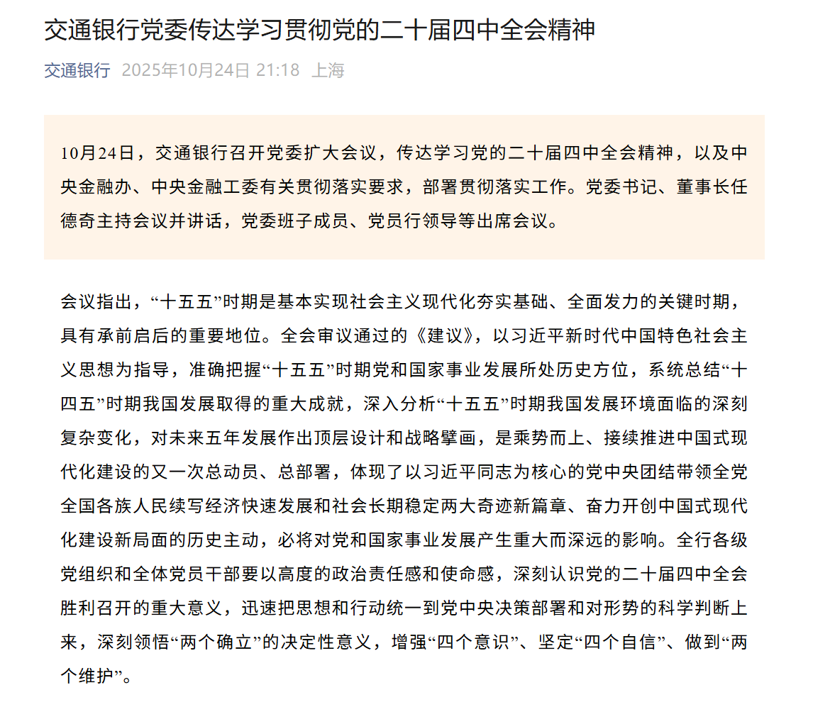 10月24日,工商銀行、農業(yè)銀行、中國銀行、建設銀行、交通銀行、郵儲銀行黨委紛紛召開會議傳達學習黨的二十屆四中全會精神,按照金融系統(tǒng)學習貫徹黨的二十屆四中全會精神會議的工作要求,研究部署貫徹落實舉措。
