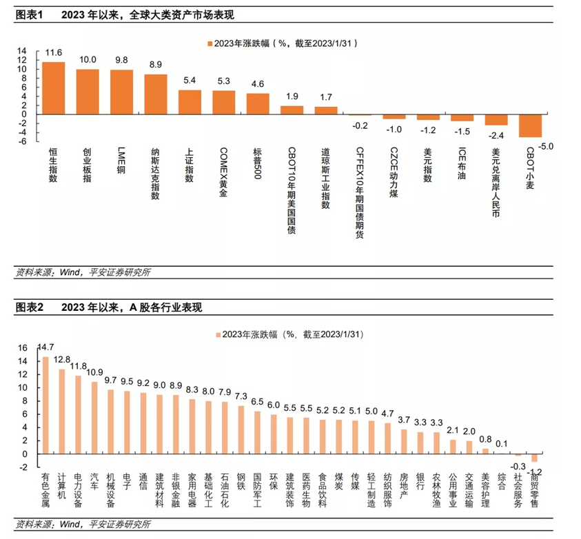 市場的短期邏輯得到了較好的印證和兌現。具體分析來看,第一,長期以來制約市場和經濟的疫情因素大幅緩解。2023年疫情將不再成為市場的核心要素,相反疫情之后經濟發展的動能何在,政府、企業、個人對于經濟發展的訴求將逐漸成為市場的主要關注點;第二,經濟在復蘇期有利于權益資產的格局不變。在確認了2022年四季度(受疫情影響)較低的增速之后(投資、消費、進出口全方位的滑落),2023年一季度中國經濟正式進入修復及復蘇階段,這不僅僅是預期先行,也是海內外的共識(關系到海外資金的持續流入);第三,結構上出行消費、服務消費先行,投資、制造等領域也將加快投入力度。1月份及春節期間市場關注的高頻數據,包括旅游、影視、出行等方面數據給予了市場一定的信心,平安證券判斷后續在制造業、投資等數據上也會出現好的變化。