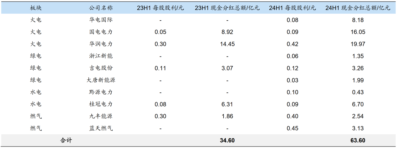 表2:2024上半年電力公司中期分紅不完全統(tǒng)計