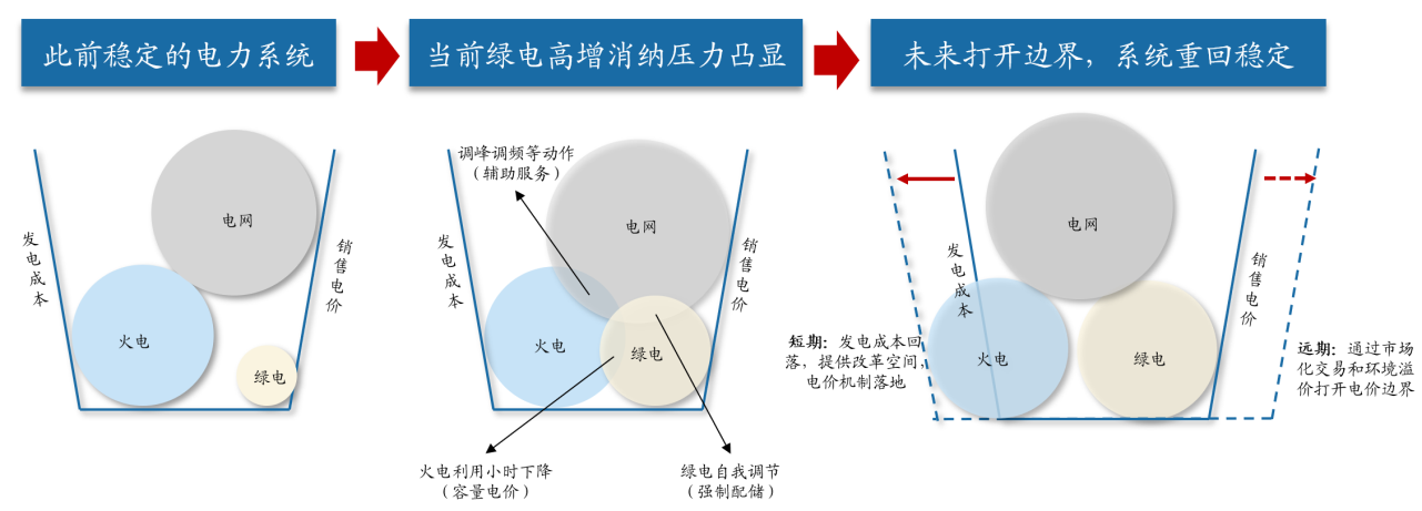 以消納率問題、政治局培訓(xùn)能源安全、綠電裝機目標(biāo)作為線索,判斷未來火電轉(zhuǎn)型調(diào)節(jié)電源、綠電裝機增長、電網(wǎng)推動建設(shè)是核心,推演出容量電價、輔助服務(wù)、煤電聯(lián)動、環(huán)境價值等政策預(yù)判;展望未來,憑借發(fā)電成本回落和終端順價,通過先改電價、再推市場化的步驟,電改或?qū)⒓铀偻瓿伞?/p>