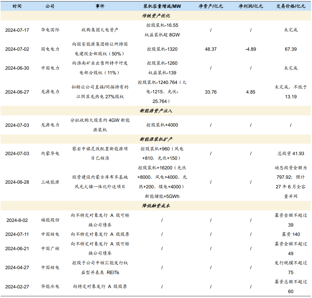 觀察電力資本運作加速→判斷行業(yè)景氣度上行:年初至今發(fā)電廠商資產(chǎn)運作活躍,主要涉及傳統(tǒng)煤電資產(chǎn)優(yōu)化、新能源裝機擴張及降低融資成本等方面。其中中國電力、國電電力專注于傳統(tǒng)煤電資產(chǎn)的優(yōu)化,華電國際收購集團煤電及氣電資產(chǎn);龍源電力聚焦大股東新能源裝機資產(chǎn)注入;三峽能源、內(nèi)蒙華電推進新能源項目核準(zhǔn)建設(shè);中國廣核、中國核電則分別發(fā)行可轉(zhuǎn)債、REITs&定增降低融資成本募資進行項目建設(shè)。