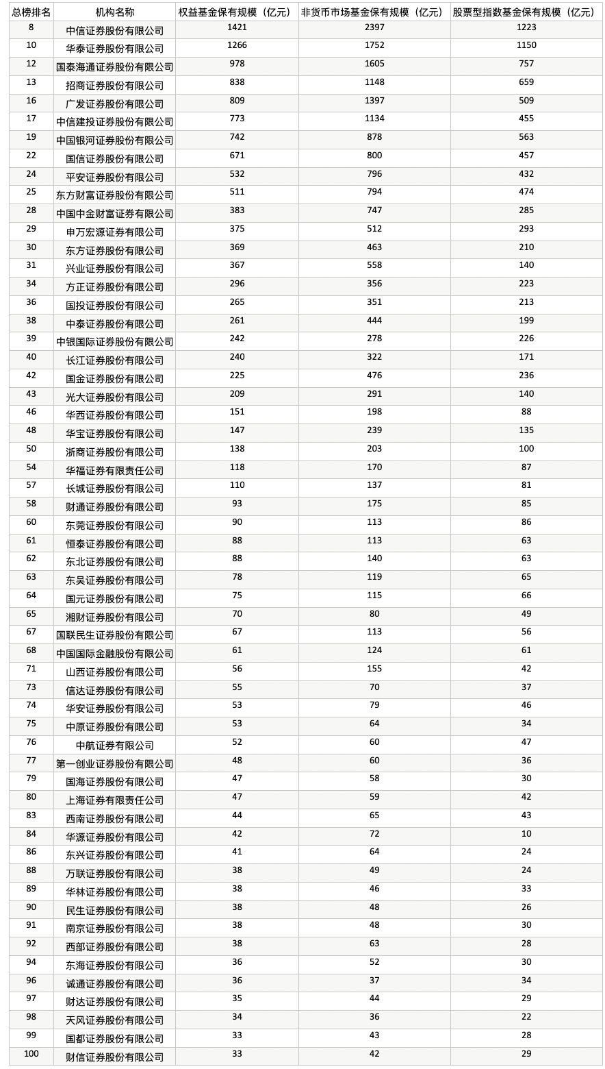 在“非貨幣市場基金保有規模”方面,保有規模位居前三名的券商分別為中信證券、華泰證券、國泰海通,保有規模分別為2397億元、1752億元、1605億元。廣發證券、招商證券、中信建投的保有規模也均超1000億元。