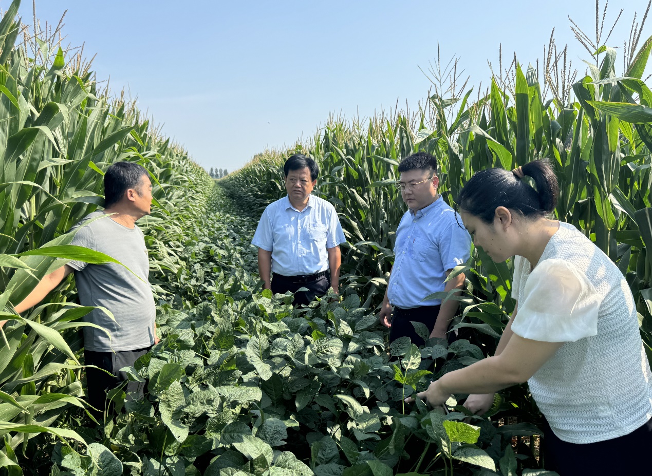 禹城市農業農村局、中國人壽財險德州禹城支公司工作人員來到帶狀復合種植基地,向種植戶了解大豆玉米長勢和相關農產品市場價格情況 王歡/攝