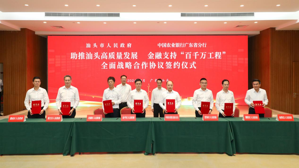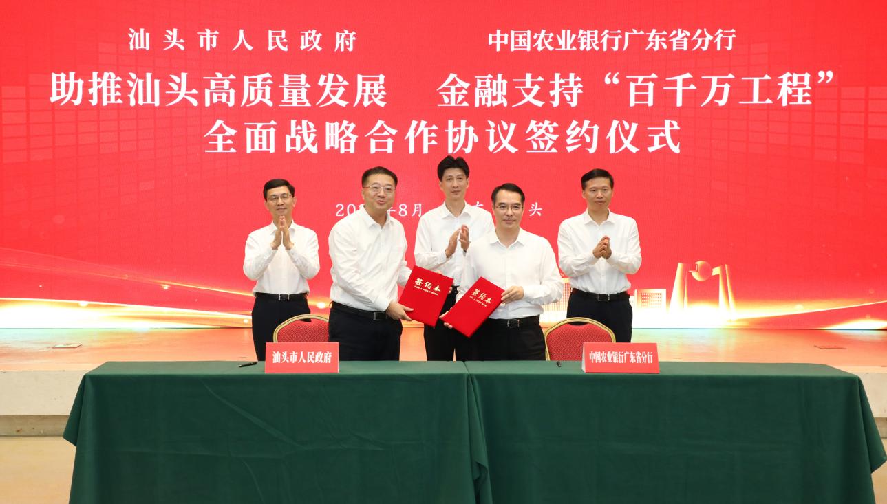 近日,農行廣東省分行與汕頭市人民政府簽署《助推汕頭高質量發展金融支持“百千萬工程”全面戰略合作協議》。