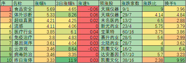從個(gè)股來(lái)看,上述三類概念板塊涉及61只個(gè)股,其中,10只個(gè)股最近4個(gè)季度累計(jì)凈利潤(rùn)虧損,動(dòng)態(tài)市盈率(TTM)無(wú)法計(jì)算,此外,即使以機(jī)構(gòu)普遍看好未來(lái)發(fā)展的科創(chuàng)板整體市盈率85.90倍為標(biāo)準(zhǔn),這些概念股中也有22只在此之上,這樣算起來(lái),上述概念股中估值較高股占比已達(dá)五成以上。再回過(guò)頭來(lái)看看周一逆市上漲的醫(yī)療概念股。可以發(fā)現(xiàn)食品安全、體外診斷、超級(jí)真菌等等概念板塊排在板塊監(jiān)測(cè)前列,漲幅均超過(guò)4%,在滬深兩市大盤均下跌的背景下,一枝獨(dú)秀。