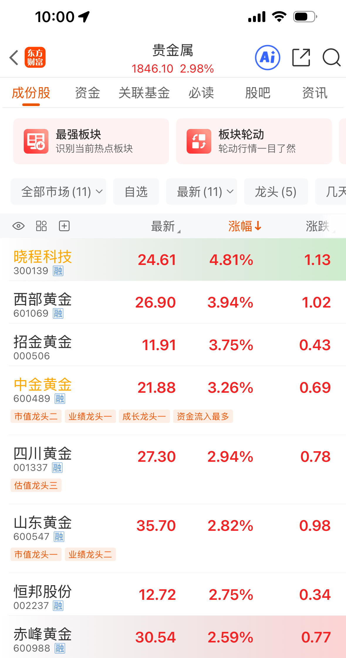 受金價上漲提振,A股早間開盤,貴金屬板塊競價高開,截至記者10點發稿時,東方財富軟件數據顯示,貴金屬板塊指數大漲2.98%,全板塊11只個股悉數飄紅;成分股中,曉程科技漲逾4%,中金黃金、西部黃金、招金黃金漲逾3%。