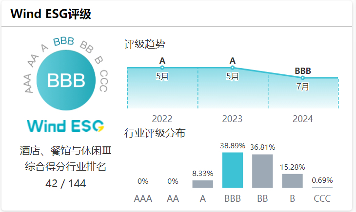 根據(jù)萬得最新ESG評級,海底撈的評級從2023年的A級下滑至2024年的BBB級,公司在環(huán)境、社會和治理三個維度上的評分均顯著低于行業(yè)領(lǐng)先水平。從海底撈的實際表現(xiàn)來看,其在社會與治理維度仍存在較大的提升空間。