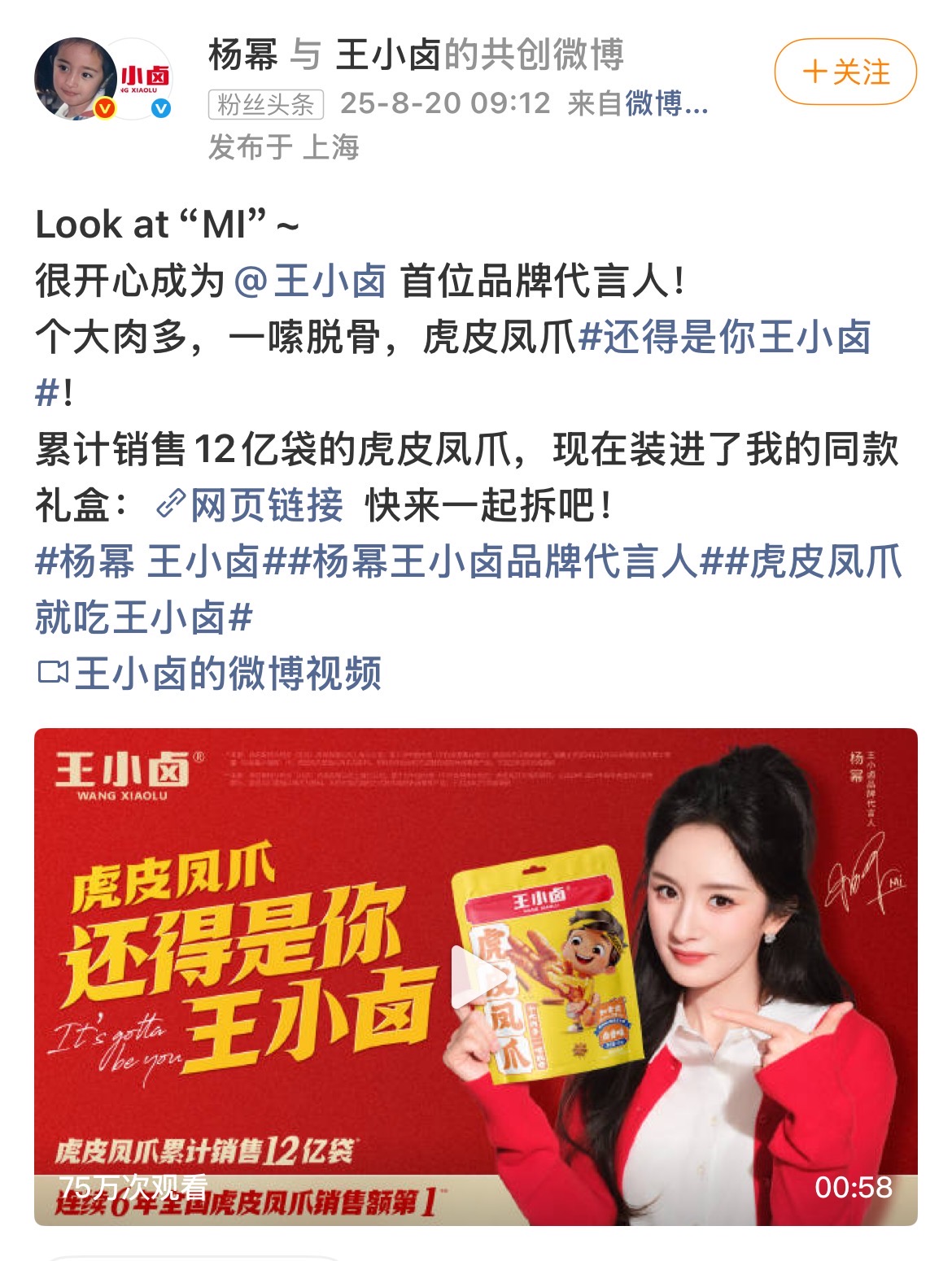 本報訊 (記者梁傲男)8月20日,北京王小鹵網(wǎng)絡(luò)科技有限公司(以下簡稱“王小鹵”)官宣楊冪為首位品牌代言人。當(dāng)日9時12分,“楊冪x王小鹵”品牌代言人官宣限定禮盒全網(wǎng)首發(fā)。