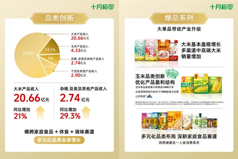 報(bào)告期內(nèi),十月稻田核心品類穩(wěn)健增長(zhǎng),多元品類布局成效顯著。大米產(chǎn)品作為核心業(yè)務(wù),營(yíng)收達(dá)到20.66億元,同比增長(zhǎng)21.0%;玉米品類營(yíng)收4.33億元;雜糧、豆類及其他產(chǎn)品收入同比增加29.3%至2.74億元。