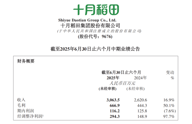 在健康飲食理念不斷深化的背景下,食品市場(chǎng)迎來(lái)了新一輪發(fā)展機(jī)遇。8月28日,家庭食品創(chuàng)新企業(yè)十月稻田集團(tuán)股份有限公司(以下簡(jiǎn)稱:十月稻田)公布了2025年中期業(yè)績(jī)報(bào)告,多項(xiàng)核心指標(biāo)表現(xiàn)亮眼。數(shù)據(jù)顯示,報(bào)告期內(nèi)集團(tuán)實(shí)現(xiàn)營(yíng)業(yè)收入30.64億元,同比增長(zhǎng)16.9%;經(jīng)調(diào)整凈利潤(rùn)達(dá)2.94億元,同比大幅增長(zhǎng)97.7%;凈利潤(rùn)率也由去年同期的5.7%提升至9.6%,盈利能力顯著提升。