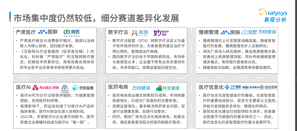 整體來看,市場集中度仍較低,行業呈多元化發展態勢,除醫藥電商外,慢病管理、醫療AI、數字療法、醫療信息化賽道均受關注程度較高。特別是自去年10月份《互聯網診療監管細則(征求意見稿)》出臺之后,“嚴肅醫療”這個相對于消費醫療的概念,被頻繁提起,給出了行業發展的鮮明指向性,讓“醫歸醫,藥歸藥”。報告指出,前期技術積累到位、具備完善合規體系的專業型平臺在競爭中將獲得更大機會。
