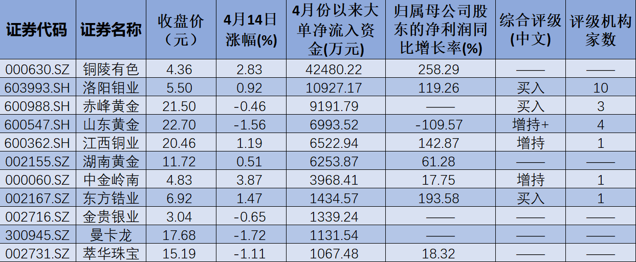 受金價不斷上行影響,黃金股已開始獲得資金青睞。4月以來,截至4月14日,東方財富黃金概念板塊期間累計上漲5.62%。從資金層面看,4月份以來,板塊內共有17只個股獲得大單資金凈流入,期間累計凈流入額為9.38億元。個股方面,銅陵有色(42480.22萬元)和洛陽鉬業(10927.17萬元)的大單資金凈流入額均超過1億元。