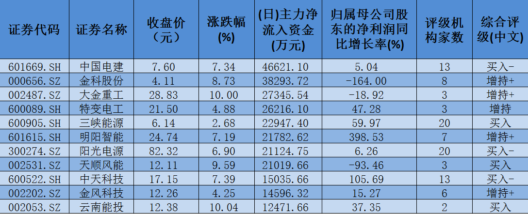 資金也是推動風(fēng)電板塊指數(shù)上漲的重要因素,截至5月19日收盤,風(fēng)電板塊共有100只個股獲得大單資金凈流入,凈流入額達到42.74億元。其中,包括中國電建、金科股份、大金重工、特變電工、三峽能源、明陽智能、陽光電源、天順風(fēng)能、中天科技、金風(fēng)科技、云南能投等在內(nèi)的11只個股獲得大單資金凈流入額超過1億元。
