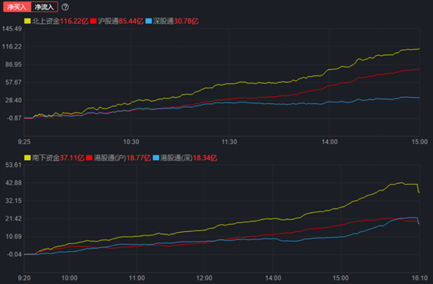 北向資金今日呈凈流入態勢,全天凈買入116.22億元,其中,滬股通凈買入85.44億元,深股通凈買入30.78億元。